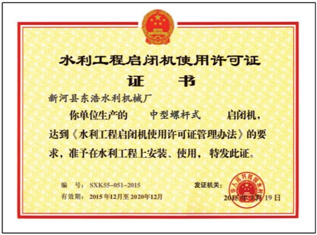 产品符合SL41-93《水利水电工程启闭机设计规范》、SD297-88《QL型螺杆式启闭机系列参数》、 SD298-88《QL型螺杆式启闭机技术条件》、SD315-89、SD296-83等系列国家标准, 多次受到省、市政府部门的嘉奖,并由水利部、农业部授予推荐品牌。 凭过硬的产品质量和合理的产品价格,在全国的水利水电工程建设项目中多次中标, 为水利水电建设做出了卓越的贡献。